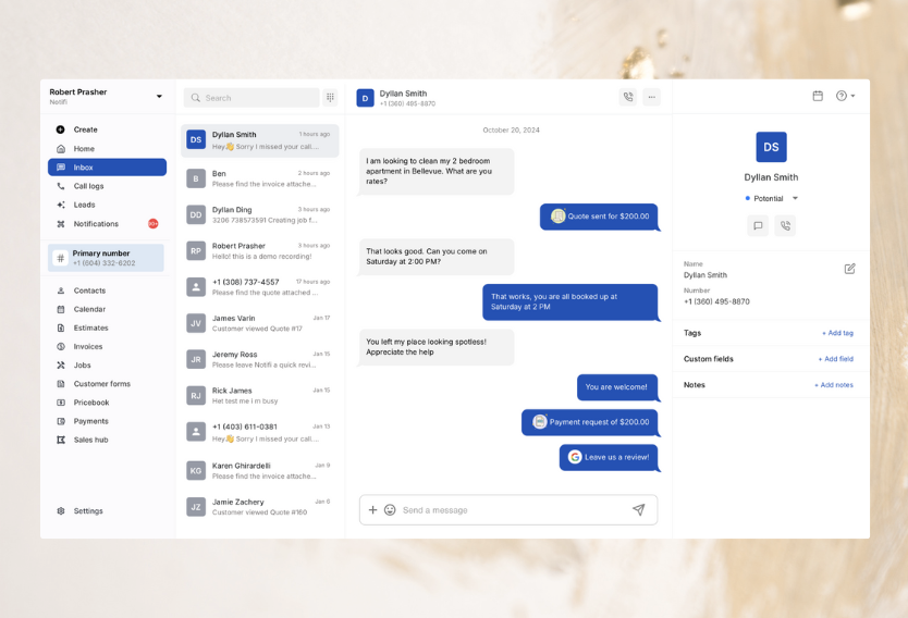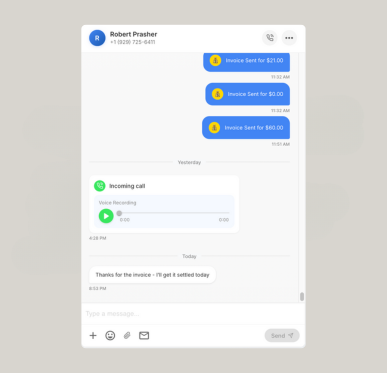 Calls, texts, and emails all flow into one workspace so nothing gets missed and every message has context.